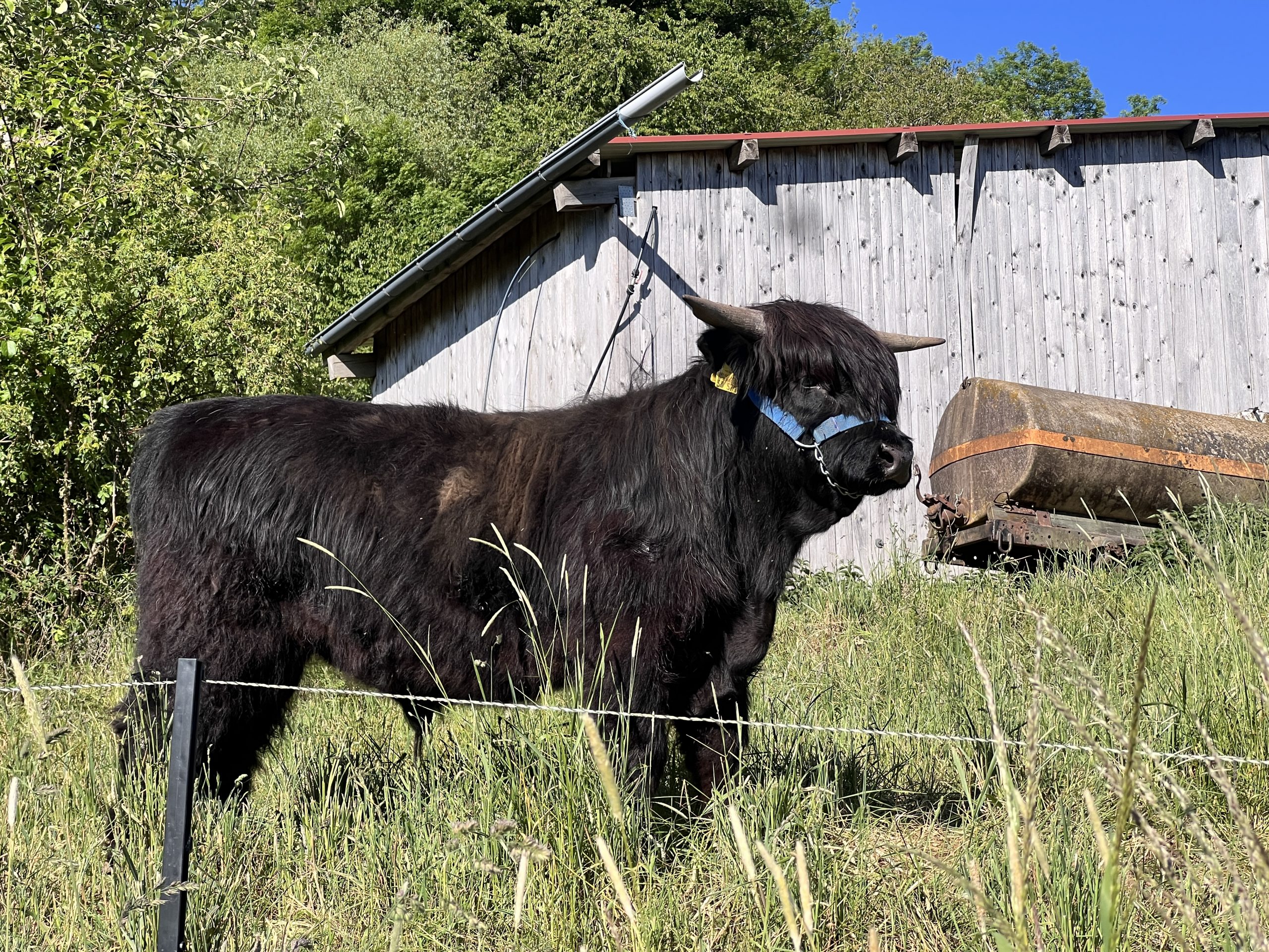 Auf unseren extensiven (Naturschutz-) Flächen hat sich Milan außerordentlich gut entwickelt, ein mittelrahmiger Bulle mit enormen Fleischansatz. Seine Korrektheit und tadellosen Bewegungsabläufe – die vom Zuchtleiter mit der Note 9 im Skelett honoriert wurden – machen ihn zum perfekten Bulle für die Beweidung unsere Steilhänge.